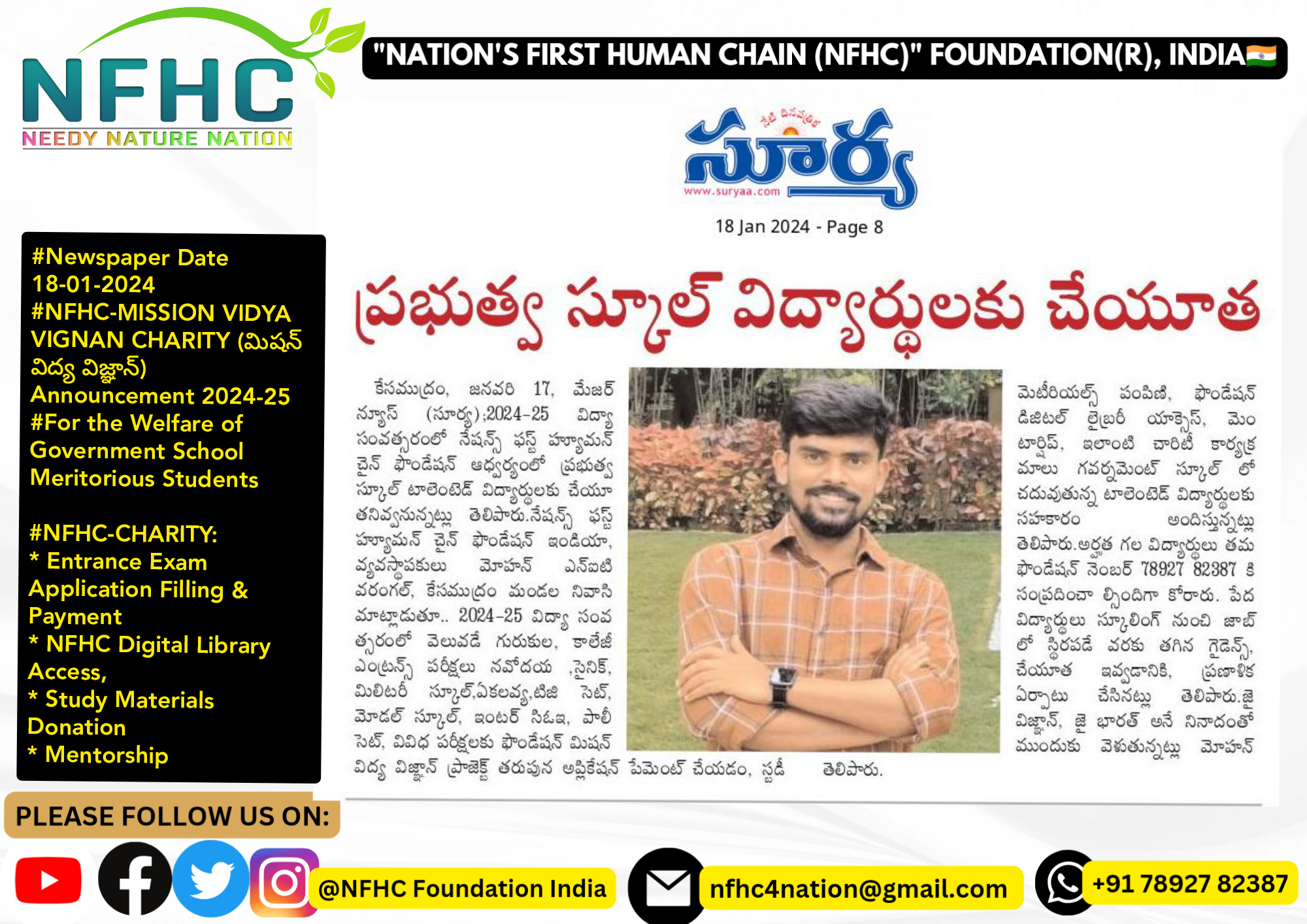 "After my father’s sudden passing, I was on the verge of dropping out from Professor Jayashankar Agricultural University due to financial challenges. NFHC Foundation provided crucial financial aid for my tuition and hostel fees and moral support, enabling me to continue my education. Thank you, NFHC Foundation!"